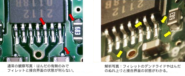 また、はんだ付け部の写真も撮り方が問題になります。はんだ付けはフラックスを使用する以上、そのフラックスの効果が最大の時はんだの接合強度も最適になるわけである。基板上において最初に熱反応を起こすのはフラックスで、約100?120℃程度で軟化しはじめる。そして溶けたフラックスは、リードやランドの熱に反応し、その周りにきれいな曲線を描く。たとえはんだ量が少なくても、適切に反応した場合は、はんだのフィレットとフラックス残渣は曲線(弧)を描くものである。外観観察の写真としてはこのフラックス残渣の形状とフィレットの接合界面を、斜め方向(時計の4時?5時、7時?8時、及び3時または9時方向)から捉えたものが必要である。また、コネクタやQFP・SOPなどでランドやそばにホールがある場合には、パターからの熱移動を判断するために上からの写真も必要になる。図13の左側の写真は、フィレット先端が少し盛り上がって見えているものの、これはんだ量が多いためなのか、あるいはフラックスの劣化でぬれ上がっていないのか判らない。しかし右側の写真では、フィレットのデンドライドやフラックス残渣やぬれ上がり状態から、フラックスの熱反応を推測することができるのである。