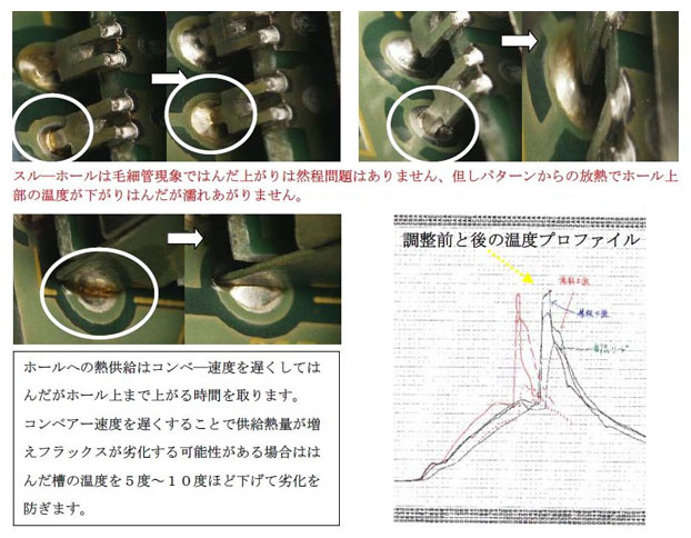 フローにおけるスル—ホール上がりは、基本的にはフロー槽の基板搬送角度からくる問題である。搬送角度は3°以下、できれば水平搬送が理想的である。