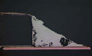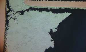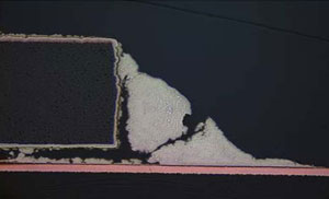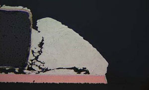 Sn3.0Ag0.5Cuを代表とする鉛フリーはんだは、一般に有鉛共晶はんだよりも硬くてもろい。鉛フリーはんだは、膨張収縮差により発生する非弾性歪量が増加するクリープ効果を有し、硬化性が有鉛共晶はんだに比べ大きいため、複数の方向にクラックが進行したり、あるcycle数を機に一気に進行したりする。図3?図6に、複数方向にクラックが進行した断面画像を、表面実装部品接合部とディスクリート部品接合部で、それぞれ示す。