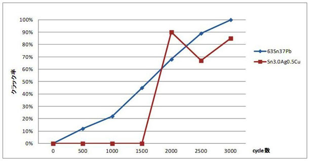 はんだ接合部に繰り返し温度変化が発生する時、プリント基板と電子部品との膨張収縮差によって応力が負荷されることは先に述べたとおりである。一般にはんだ合金の絶対温度表記における融点(Tm)と使用温度との比が0.5以上となった場合に、クリープが発生しやすくなるとされており、Sn3.0Ag0.5Cu鉛フリーはんだでは、常温において融点比が0.6、85℃で0.73、125℃で0.81となり低サイクルで損傷が発生する可能性が高い。