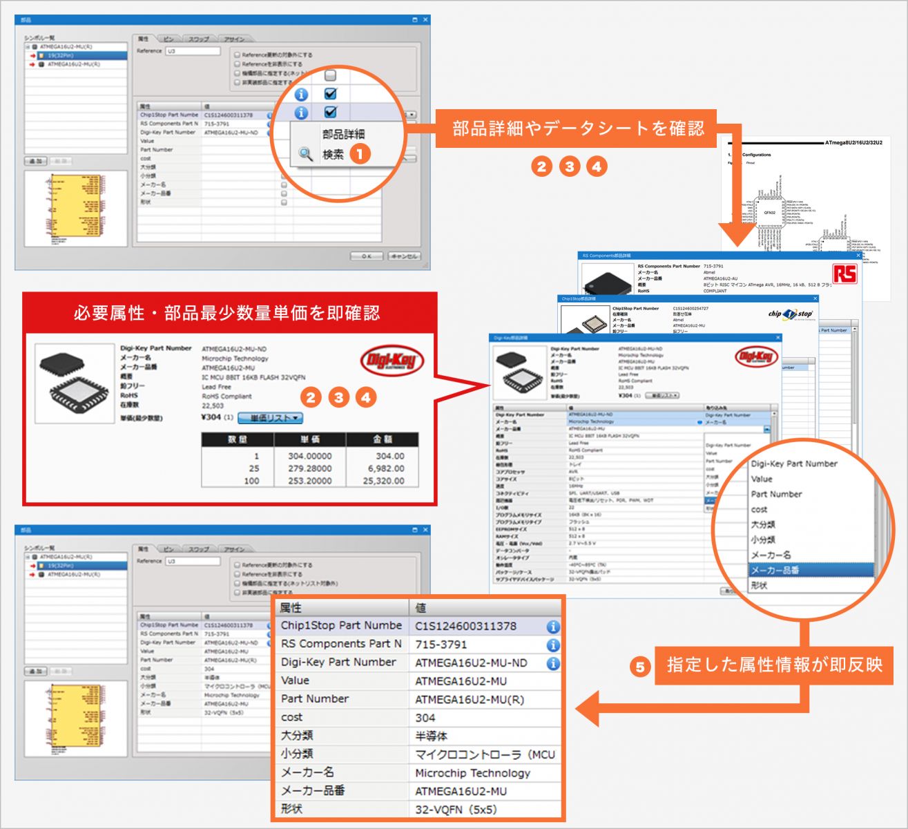 Quadceptの回路図上で最新の部品在庫、価格を参照しながら、部品の作成と電子回路設計を行うことができる。部品情報や在庫状況、廃番情報は日々刻々と変化するものであるが、この連携機能により、後工程を考慮した設計を行い、出戻りを防ぐことができる。