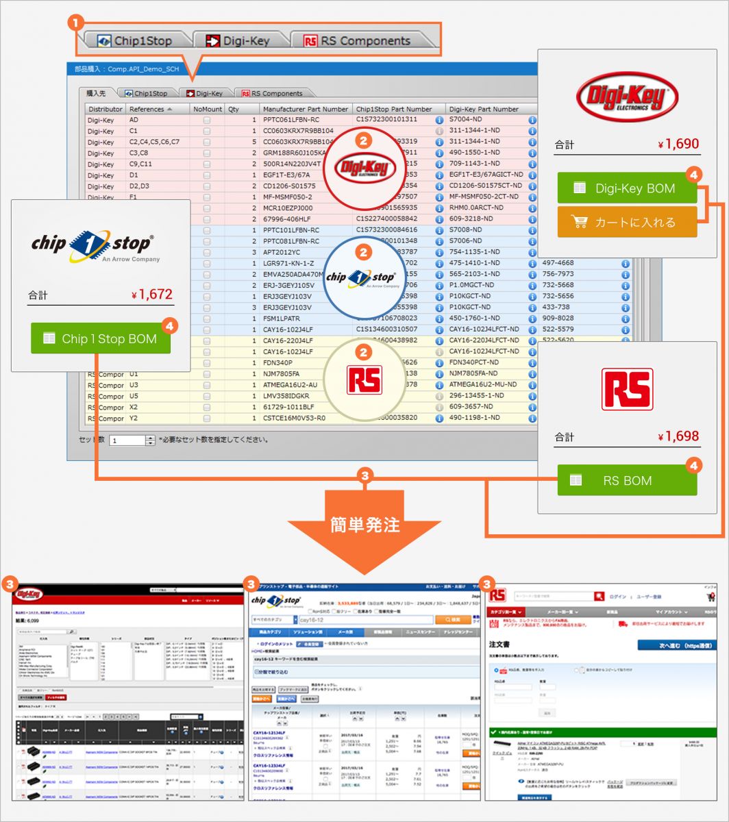 そこで、Quadceptは、世界最大級のオンライン電子部品ディストリビュータDigi-key社(デジキー)、RS社(アールエスコンポーネンツ)、国内のチップワンストップ社と業務提携をし、3社の取り扱い部品合計約2000万点の部品情報データベースと連携、回路設計をしながらリアルタイムで部品情報を確認することができるようになった。