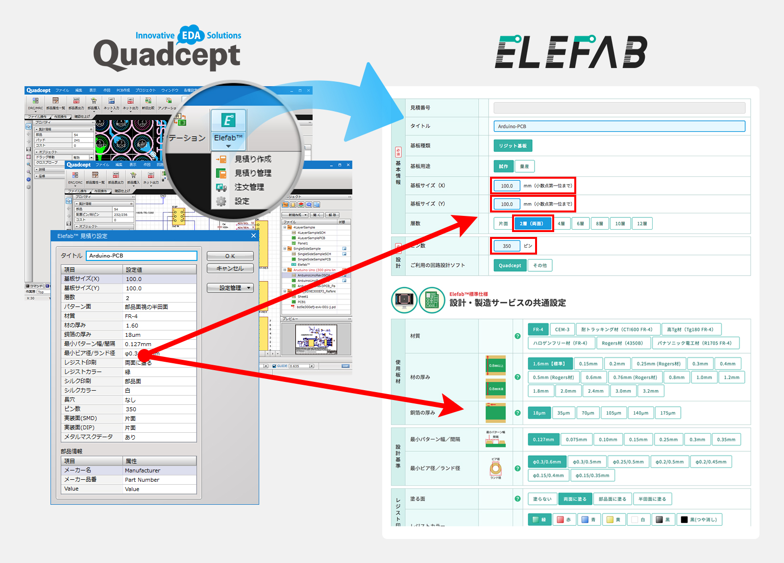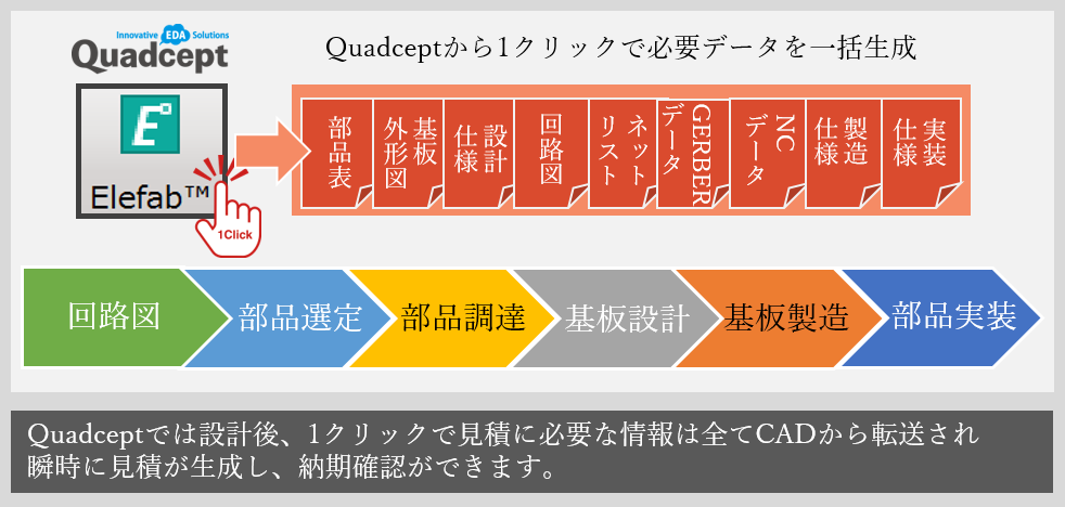 まる。同じデータを各社に送り、見積を比較し、それぞれに指示書を作成して送らなければならないことも多く、見積をとるだけでも大きな労力が必要になる。そこで、Quadceptでは回路・基板CADとものづくりのワンストップサービス『Elefab』をシームレスに連携し、WEB上で簡単に見積の依頼、納期の確認、発注、見積・発注履歴の確認ができるようになっている(図4)。