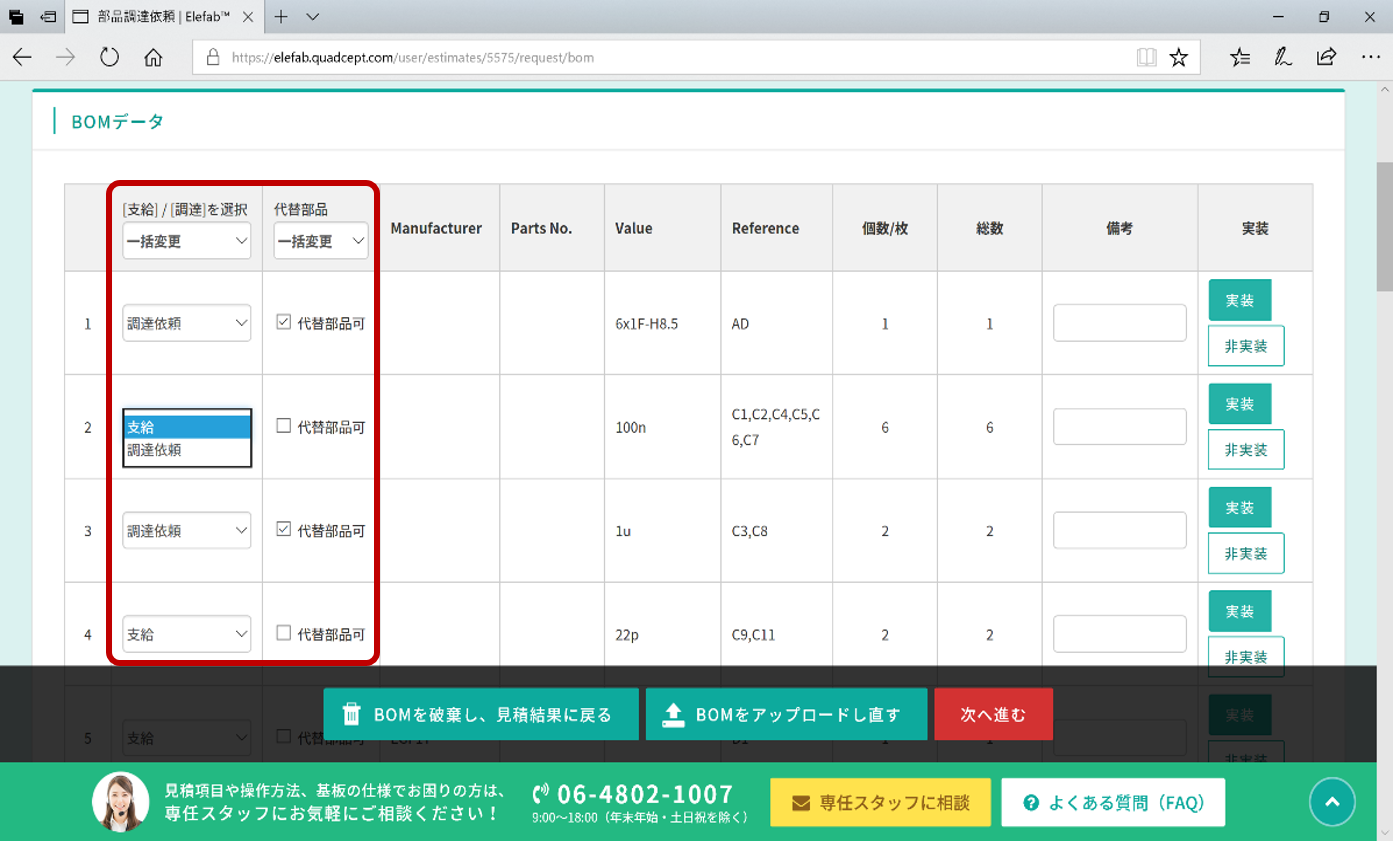 部品表画面では部品調達を個別で指示することができ、廃番の可能性や在庫数量が少ないことが予想される場合に『代替部品可』をチェックすることで、『Elefab』側で部品の在庫状況を調査でき、万が一、調達困難な場合は『Elefab』側で代替部品をご提案させていただく。