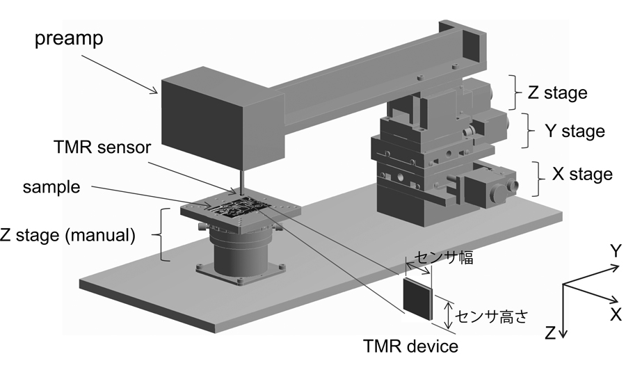 EM-FRMに必要となる2次元磁場データマトリックスを測定する走査型トンネル磁気抵抗効果顕微鏡装置の装置構成を以下に説明する。走査型トンネル磁気抵抗効果顕微鏡の装置構成図を図4に示す。TMR(Tunneling Magnetoresistance)センサは、外部磁場により磁化方向が変化しない磁性体のピン層と外部磁場によって磁化方向が変化する磁性体のソフト層との間に厚さ数nmの絶縁層の3層構造をしており、外部磁場により両サイドの磁性体の間の抵抗変化を磁場強度として検出する。プリアンプを介して16ビットのADボードを有するPCへ信号が取り込まれる。ステッピングモータで駆動するZステージ、Yステージ、XステージはPCからの制御によりTMRセンサを走査することができ、走査エリアの磁場分布(2次元磁場データマトリックス)が得られる。TMRセンサの姿勢は、素子の膜が走査するY軸に対して直交するように組み立てられており、検出できる磁場はZ方向成分である。試料を手動のZステージに固定した後、TMRセンサとの間隔を調整して試料のセッティングは完了する。独自に開発したプログラムを用いて自動運転により2次元磁場データマトリックスが得られる。測定結果から上述の再構成アルゴリズムEM-FRMを用いて任意高さの磁場分布が得られる。