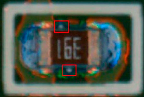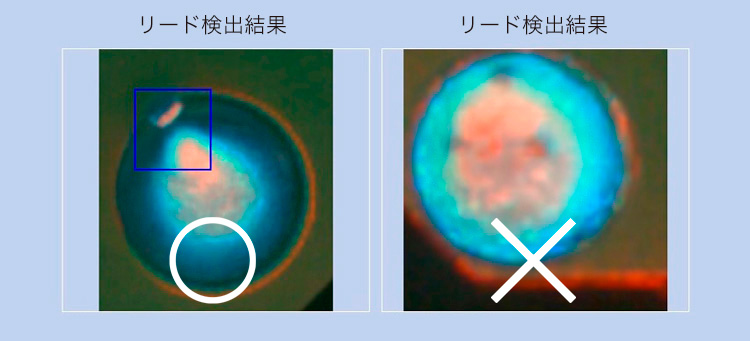 同様に、良品モデルを定義することが難しい対象として、はんだ面の挿入部品のリード形状が挙げられる。リードの傾き具合は一定ではなく、そこにはんだが付くため、形状が変化しやすい。これもDeep learningによる学習を行うことで、リード抜けといった従来の検査では困難であった不良の検出を実現している(図11)。