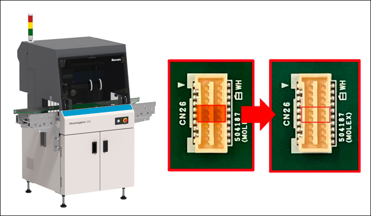 SMTのコネクタなどの異形部品は、吸着力を高めるためにマウント用吸着テープが貼付されているが、これまでは除去作業と剥がし残し検査は人手に頼っていた。