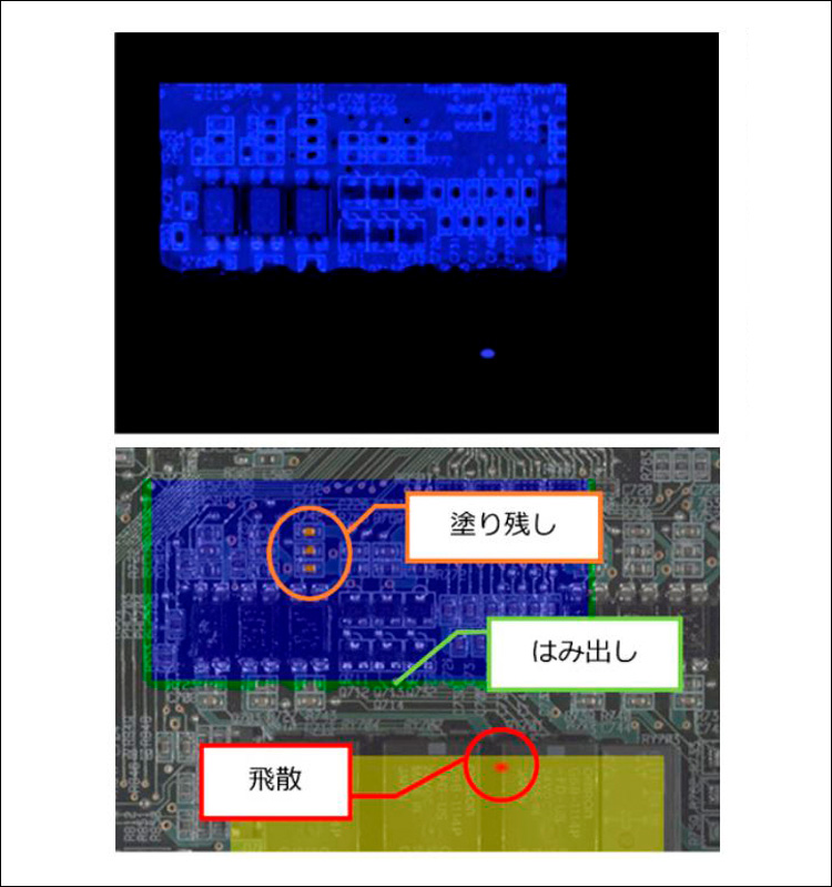 基板コーティング装置では、UV照明を用いた塗布後の塗布検査機能を搭載している。塗布データを基に下記の検査を実施する。