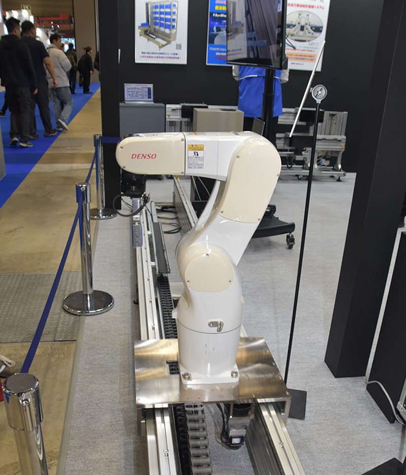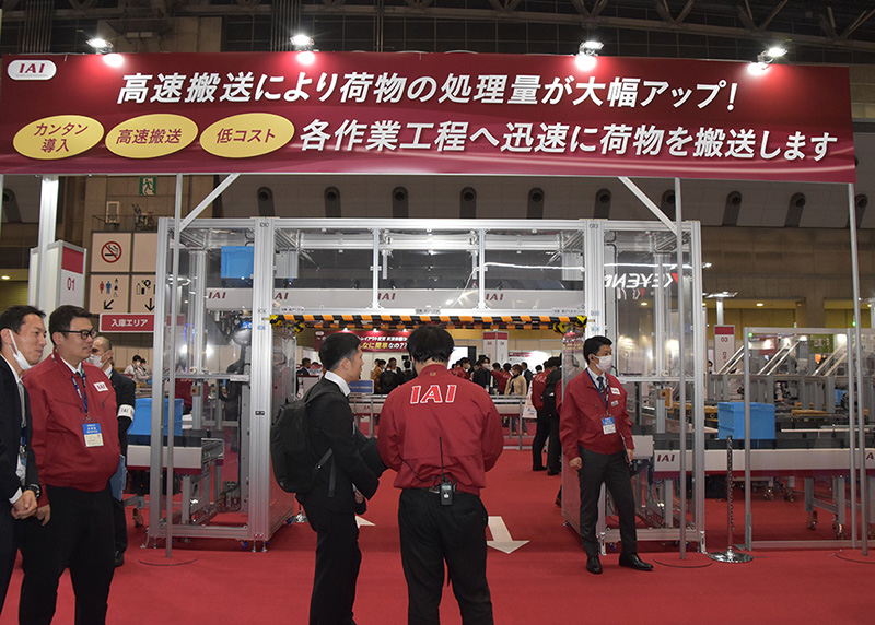 (株)アイエイアイは、高速かつ衝撃のない搬送を実現した物流分野の『ロボットコンベヤ』の展示と搬送デモンストレーションを行っていた。