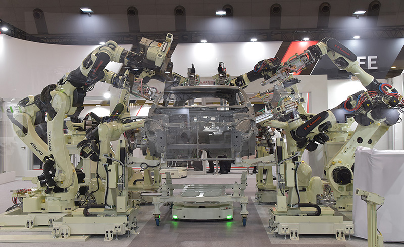 川崎重工業(株)は、従来の固定式搬送装置に代わり、AMRを活用した車体組み立てラインのデモンストレーションを行っていた。