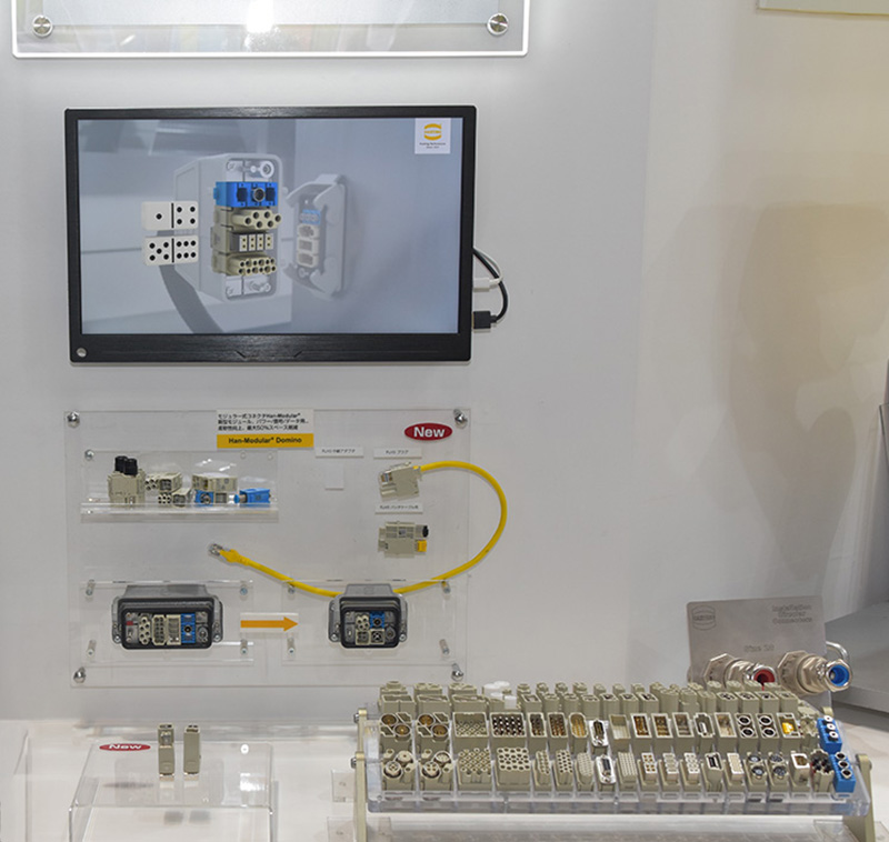 ハーティング(株)は、新型産業用モジュラ式コネクタ『Han-Modulae Dominoモジュール』及び工具不要の新しい結線技術『Han Push-inインサート』の展示を行っていた。