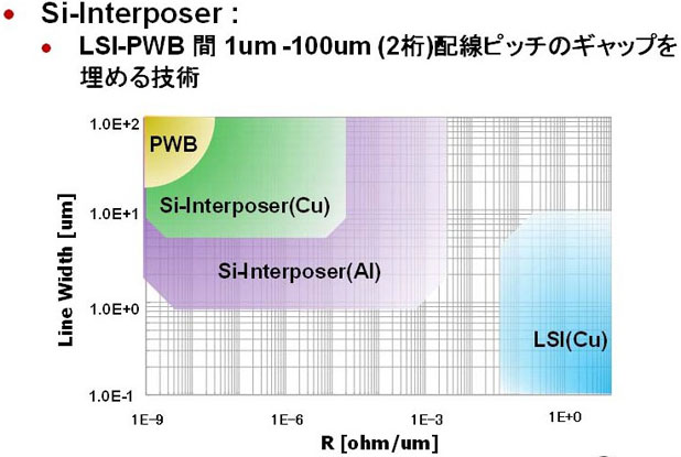 Siインターポーザ技術の位置づけは、プリント配線板(printed wiring board:PWB)との間で図8に示す考え方である。