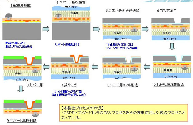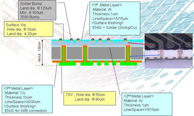 当社のシリコンインターポーザ製造フローは図9に示す通りである。図10に当社で試作したシリコンインターポーザの設計例を示す。さらに当社ではコンデンサ(C)及びインダクタ(L)を内蔵したシリコンインタポーザの試作も行っており、構成を図11に示す。