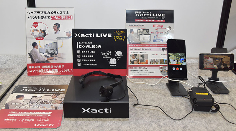 (株)ザクティは、『CEATEC AWARD 2023』でデジタル大臣賞を受賞した現場DXソリューション『Xacti LIVE』及びウェアラブルカメラ『CX-WL100W』の展示を行っていた。