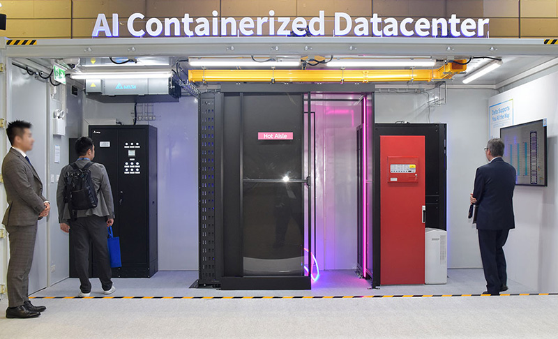 デルタ電子(株)は、AIエッジコンピューティングの急速な普及に対応するソリューションであるプレハブ型AIコンテナデータセンターの展示を行っていた。