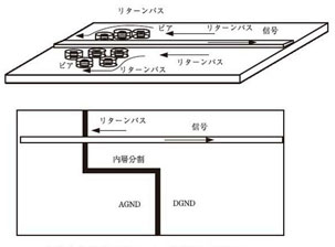同時スイッチングノイズだけでなく、信号の変化が電源やグランドプレーンにノイズを誘導して、これがまた、信号に伝わって、と、信号と電源/グランドのコラボレーションで発生するノイズもあります。たとえば、プレーンの切れ目の上の層を高速信号が横断した場合や、差動平衡配線が不平衡で配線された場合などです(図11)。