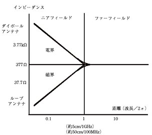 電界と磁界は、放出されて波長の2π分の1までの距離に到達すると電磁波へと性質を変えて伝播します。この電界や磁界の性質をもっている区間を近傍界(ニアフィールド=Near Field)、電磁波に変化した後を遠方界(Far Field)と呼びます(図14)。