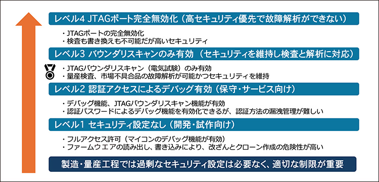 図4に一般的なJTAGポートのセキュリティレベルを示した。セキュリティレベルを高めつつ、検査、故障解析による機器の回復能力を維持するためには、バウンダリスキャンのみ有効にすることを推奨する。ただし、求められるセキュリティレベルは、取り扱う情報と機器の用途により、どのレベルにすべきか検討する必要がある。