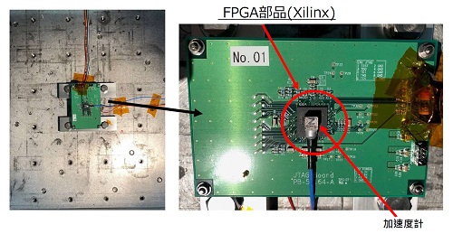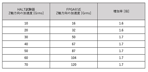 短時間で信頼性評価を行うために、HALT試験装置の加速度を70 [Grms]に設定し、FPGA付近の加速度を120 [Grms]として試験を行うことにした。