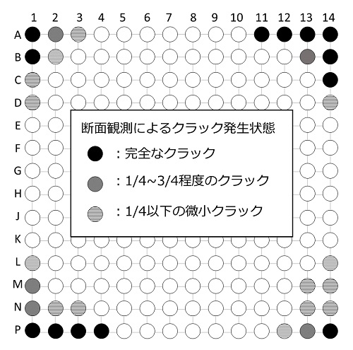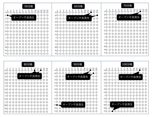 図中の黒丸の箇所は、試験全体の中で各状態において、1回以上オープン不良を検知した箇所である。