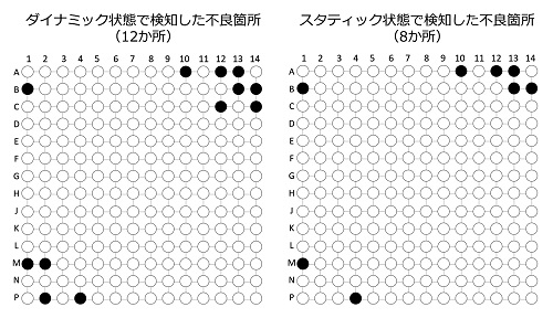 ダイナミック状態で検出したオープン不良が12か所に対して、スタティック状態で検出したオープン不良は8か所となった。