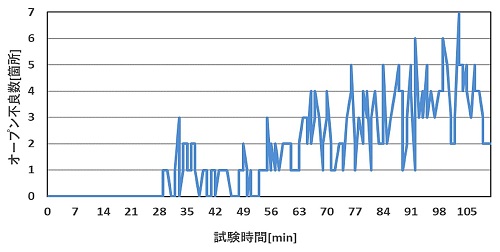 振動の影響によってサンプリングしたタイミングでBGAのボールと基板が接触しているか、接触していないかにより合否判定が変わるため、オープン不良箇所の検出数が上下に振れているが、時間が経過するにつれ、オープン不良が増えていることがわかる。
