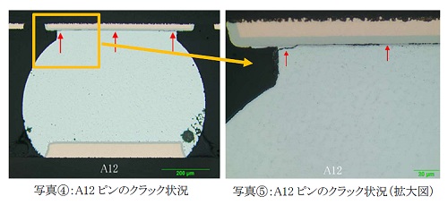 A12ピンの断面観察結果より、JTAGテストで特定したボールの上面に、完全にクラックが発生していることが確認できた。