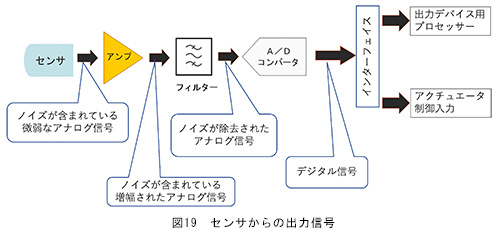 センサが本来の目的通りに活用されるために信号変換がある。通常センサ出力は微弱なアナログ信号であり、微弱信号なアナログ信号の出力を高め、次にプロセッサで扱うためには、デジタル信号に変換する必要がある。アナログ信号には通常雑音(ノイズ)があるため、ノイズ除去のため適切なフィルタを挿入する必要がある。また出力された信号はそのままでは役に立たないため、出力デバイスで表示するかアクチュエータで機械的動きに変えるなどの周辺機器が必用となる(図19の「センサと周辺機器」参照)。