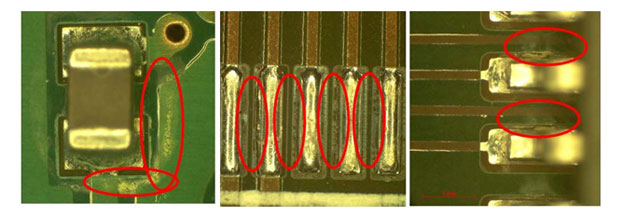 無洗浄フラックス及びはんだペーストの開発により、洗浄性能に制限があることが実証されてきた。特に、プリント基板がIPA/アルコールで洗浄されている場合、フラックス残渣はしばしば完全に除去されず、その結果が白色残渣(図2)として形成される。