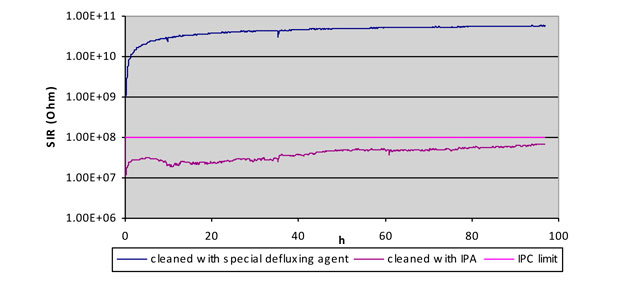 フラックス活性剤は、吸湿性の酸をベースとしており、108Ωの許容限度(図4)以下に表面絶縁抵抗(SIR)の値を減少させ、電気化学的マイグレーションや腐食などの長期信頼性の問題を引き起こす可能性がある。