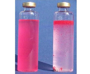 図6 溶剤に溶解したコンタミ(左)、MPC洗浄剤の中で沈殿するコンタミ(右)