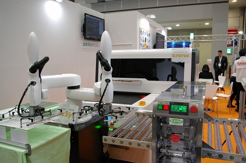 『ACSys』はワークサイズ対応の平積み基板投入/取り出し機であり、ティーチング不要でパッド調整のみで品種切り替えが行える製品で、ブースではこの2 製品を連携したデモ展示を行っていた。