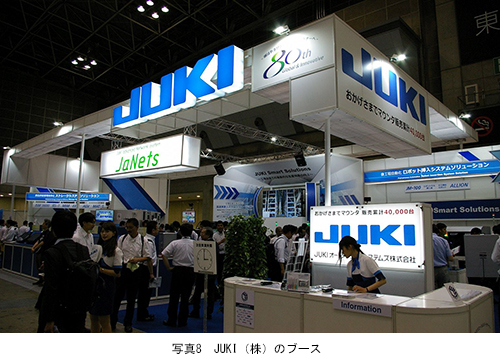 JUKI(株)のブースでは、実装統合システムソフトウエア『JaNets』を中心に、「JUKI Smart Solutions ?工場全体での革新的な生産効率の向上?」というテーマで展示を行っていた(写真8)。