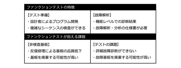 製造ラインにおいて、ファンクションテストは、ストラクチュアルテストの次のステップとして実施され、動作上の問題点(システムスピードや特殊なシーケンスの下でのみ発生する問題点)の不良を検出することを目的としている。ファンクションテストの特徴として、設計変更に対して対応できないことである。小さな設計変更でさえ、苦労して開発したテストプログラムが無駄になってしまう。その上、ファンクションテストでは、製造上の不具合に対して故障箇所を明確に特定できないため、フォルトカバレッジが低い可能性がある。