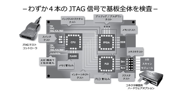 基板レベルの検査であるJTAGテストは、図7のような基板の外部に接続されたJTAGコントローラから実行する。JTAGテストでは、必ずインフラストラクチャテストをテストシーケンスの最初に実行する。インフラストラクチャテストでは、JTAG対応デバイスが正しい型番、リビジョンの部品であるか、JTAG信号の断線、ショート、ハンダ不良などの不良を検出できる。