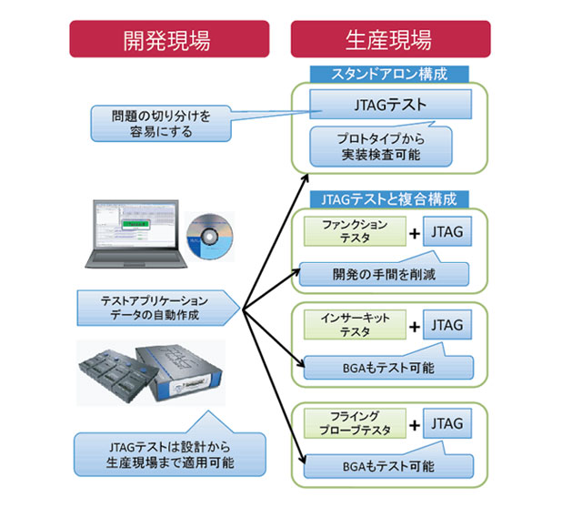 一般的なプリント基板の量産製造ラインは、十分なテストカバレッジを保証するため、いくつかの検査手法の組み合わせによる補完テストを行っている。JTAGテストを導入している多くの工場では、すでに所有しているインサーキットテスタ、ファンクションテスタ、フライングリードテスタの装置にJTAGテスト機能を組み込んで使用している。したがって、現行の製造ラインの中で、テストの工程を新たに追加することなく、JTAGテストによりBGA搭載基板を含む高密度基板をテストできることになる(図12)。