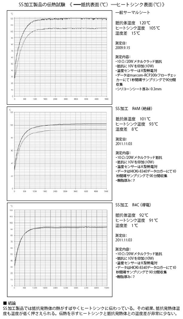 これらの温度の変化から③については、明らかにほとんどの抵抗体の熱が速やかにヒートシンクに伝わり、ほとんど温度差が出ていないことと抵抗体自体の温度が放熱シート挟み込み方法より30℃近く低下しており、発熱部の温度負担がこの結果非常に少なくなっていることが分る。