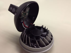 昨今では、LEDランプの発熱部分の有効な放熱方法として、強制空冷方式でファンをヒートシンクに組み込む方式も採用されてきており(写真1)、熱冷却という見地から、多様な手段を構築せざるを得ない状況になってきていることも追記しておきたい。
