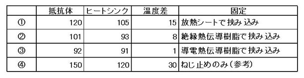 リファレンスとして、単に抵抗体にヒートシンクをネジ留めした結果を表2の④に示す。