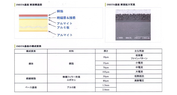 熱伝導性と線膨張係数の違いによる不具合の発生を解決するために考案された一例がIMST基板である。IMST基板(図4)ではアルミ板の表面にフィラーを充填された絶縁層が形成されており、熱伝導性を調節することができるとされている。
