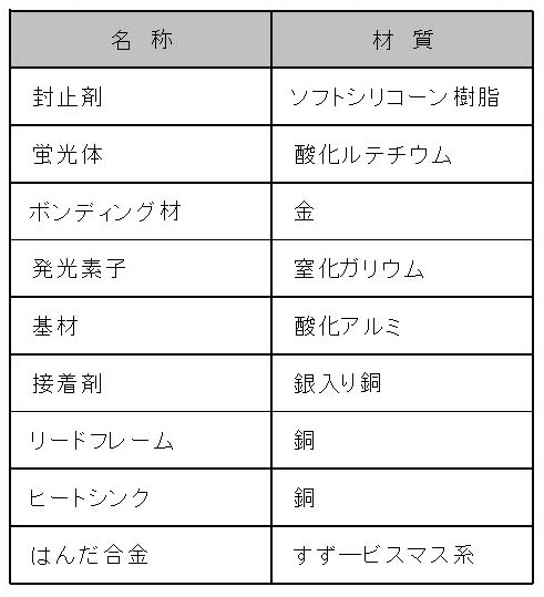 照明用に使用されている白色LEDの構造を解明するためには断面方向から光学顕微鏡、走査型電子顕微鏡を使用し、各部材の材質を調査するためには電子線マイクロアナライザを使用する。市場から調達した照明用白色LEDの構造解析結果の一例を表1に示す。