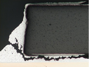 しかし、アルミ基板に直接LED部品を実装した基板を熱衝撃試験すると、図7のように、チップ部品のはんだ接合部にクラックが発生する。これは、アルミ基板は放熱特性にすぐれているものの線膨張係数も大きいため他の部材間で線膨張係数に差が生じ、基板周辺に繰り返し応力が発生した場合、接合力の弱いはんだ界面でクラックが生じるのである。したがって、アルミ基板に直接LED素子を実装することを禁じている場合もある。