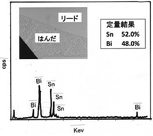 LED素子を実装するはんだは、当然、RoHS指令を遵守した鉛フリーはんだ合金であると共に、LED素子周辺の温度変化を考慮したはんだ合金を選択する必要がある。現在、家電分野で一般的に使用されているSn-Ag-Cu系鉛フリーはんだ合金は従来のSn-Pb系共晶はんだ合金と比較して固くてもろい特性をもつ合金であり、照明用LEDの急激な温度変化に対応するための最適な合金とはいえない。照明用LEDの実装には点灯時⇔消灯時の急激な繰り返しの温度変化を吸収できる柔らかな合金が望ましく、In入り鉛フリーはんだ合金が有望である。しかし、家電量販店で調達した照明用LED電球を解析した結果(図8を参照)、Sn-Bi系鉛フリーはんだを使用しているものを発見した。この合金は融点が低く且つ安価な合金であるが、Sn-Ag-Cu系鉛フリーはんだ合金よりもさらに固くてもろい性質を有しており、国内では限定された環境下で稼働する製品(常時一定温度に空調でコントロールされており、製品自身を一度設置すれば移動することがない)にしか実績のない合金である。したがって、本合金を温度変化の大きい照明用LEDの実装に使用するためには、十分な検証が必要と思われる。