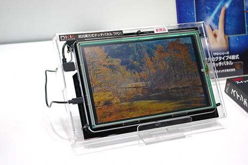 NKKスイッチズ(株)のブースでは、抵抗膜方式の採用により、流れるような操作感、なめらかなマルチタッチを実現した、アナログタイプ4線式タッチパネル『TP01シリーズ』を紹介していた。