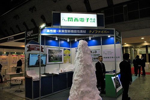 関西電子(株)では、ナノファイバ紡糸量産を可能にする装置、溶融紡糸装置『KNTタイプ』に関する展示を行っていた。
