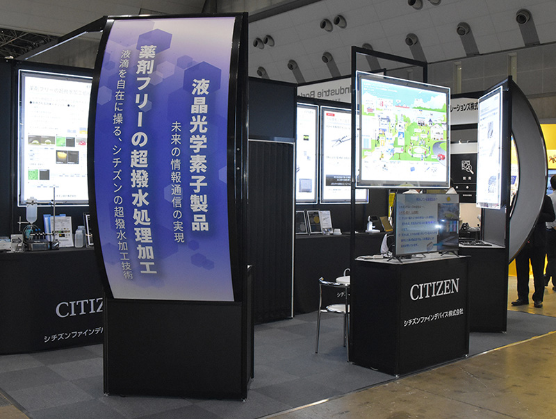 同ブースでは、シチズン時計による薬剤フリーの『超撥水加工』、シチズンファインデバイス・マイクロデバイス事業部の微細加工+接合封止や機能薄膜による『MEMS製造受託』、同・電子デバイス事業部の『液晶ディスプレイ』、同・ファインプロセッシング事業部の『医療ツール(金属部品加工)』など、多岐にわたる技術╱製品の展示や紹介をしていた。