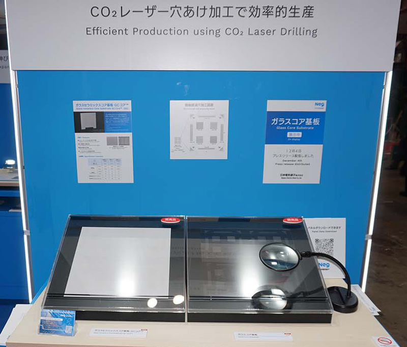 日本電気硝子(株)は、ガラス粉末とセラミックス粉末の複合材を使用した次世代半導体パッケージに適したガラスセラミックスコア基板『GCコア』の展示を行っていた。
