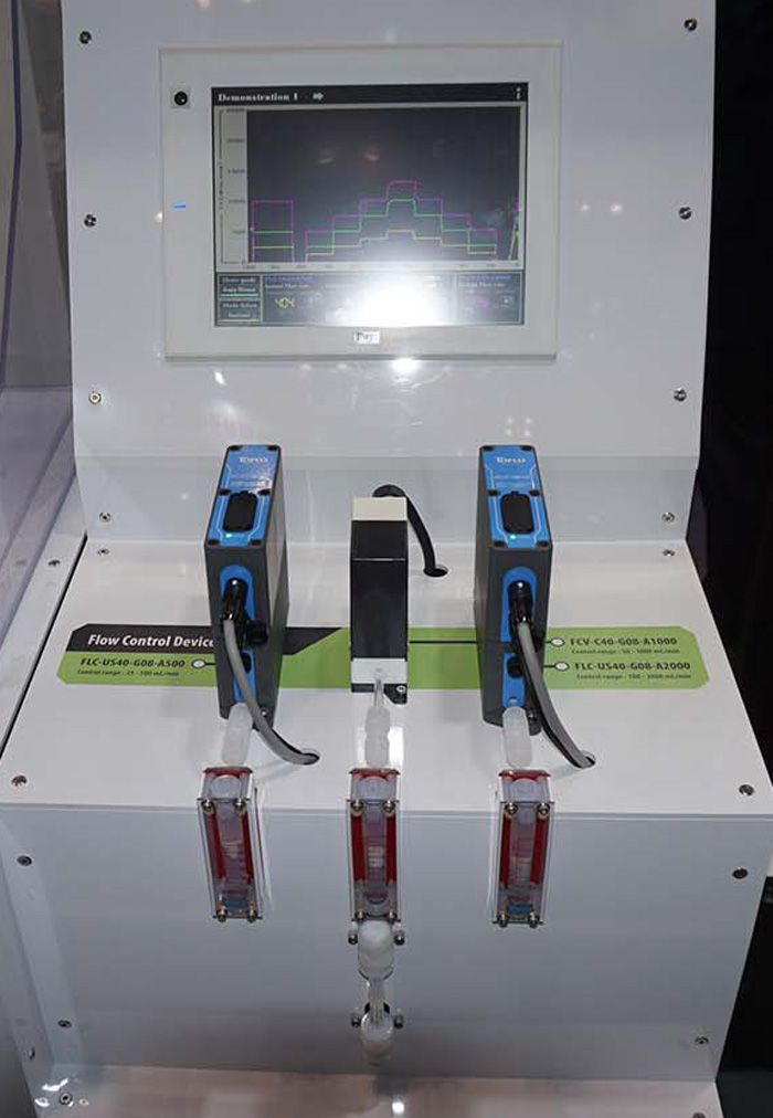 東フロコーポレーション(株)は、流量計と制御バルブを一体化し、省スペース設置が可能なフローコントローラ『FLC-US40』の展示を行っていた。