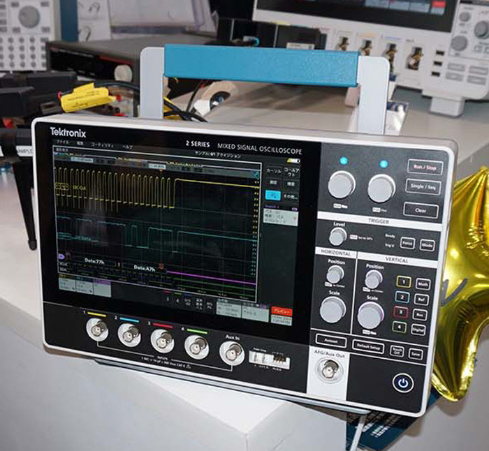 テクトロニクスは、ベンチからフィールド、製造ライン、車載、教室、在宅など、様々な現場に対応するミックスドシグナルオシロスコープ『2シリーズMSO』の展示を行っていた。