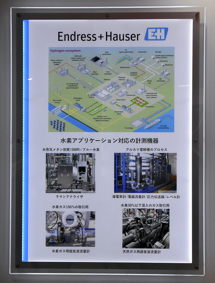 パネル『水素アプリケーション対応の計測機器』では、水蒸気メタン改質(SMR)で使用するラマンアナライザ、アルカリ電解槽のプロセスで使用する導電率計/電磁流量計/圧力伝送器/レベル計、水素ガスの取引用で使用する水素ガス用超音波流量計、水素30%以下混入のガス取引用で使用する天然ガス用超音波流量計が紹介されていた。